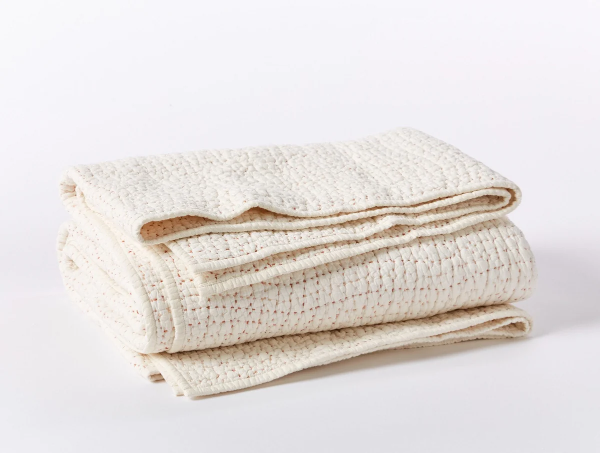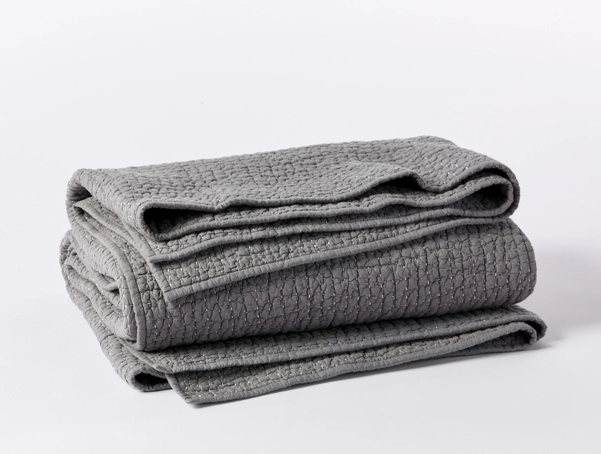 Inspired by the traditional kantha quilts of India. To create these calming waves of tiny, contrasting stitches, we embroider each quilt by hand. Natural variations in texture wrap you in breathable comfort that layers beautifully. For the Undyed version, the threads are multi-colored. We use premium organic cotton for the interior batting and outer shell. These natural fibers feel breathable and soft to the touch, an ideal layering piece for year-round comfort.