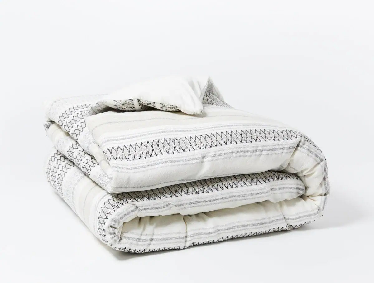Our duvet cover’s stripes are dobby woven from yarn-dyed cotton for pleasing detail and texture and lasting quality. They’re set off and backed by undyed cotton, for a balance of crisp contrast and natural warmth. Designed for use with or without a top sheet.